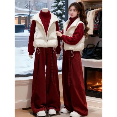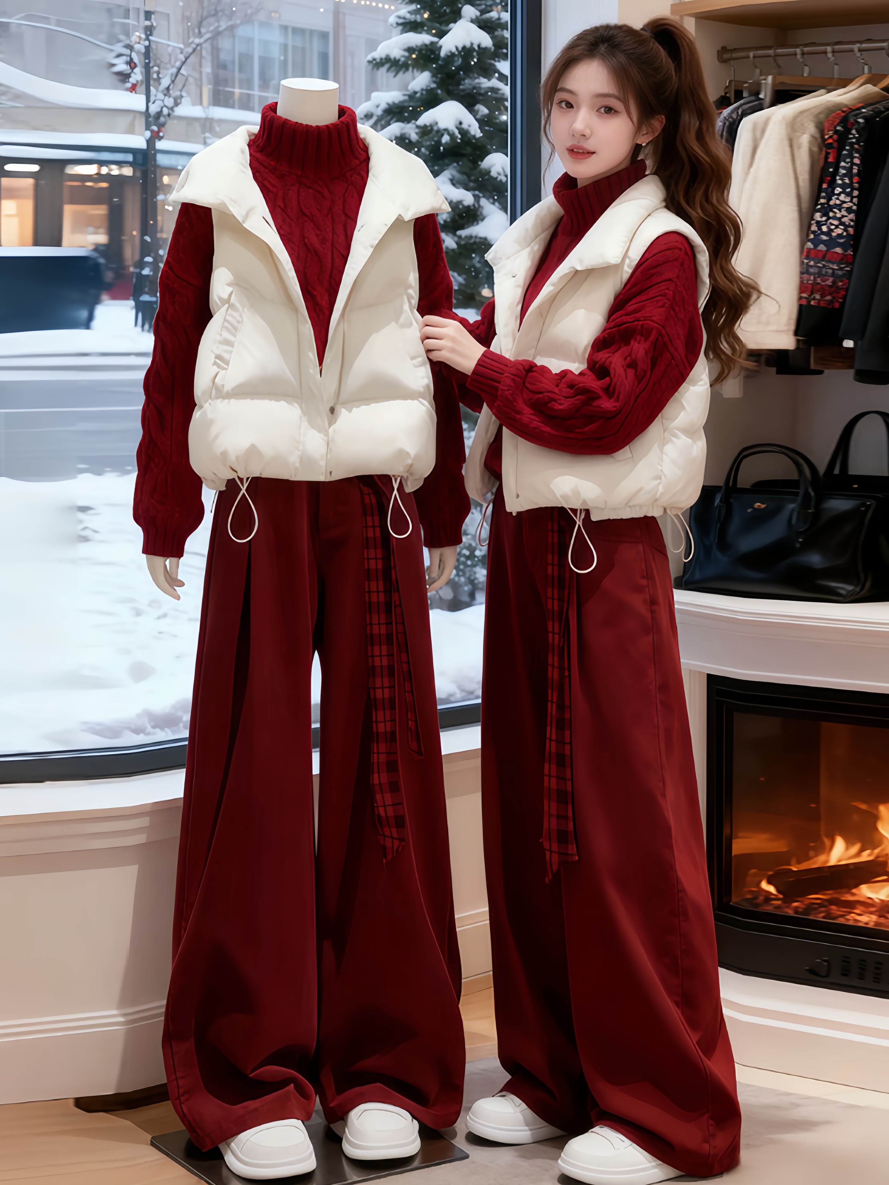 韩系一整套ootd穿搭白色马甲棉服复古红色毛衣阔腿裤三件套装...